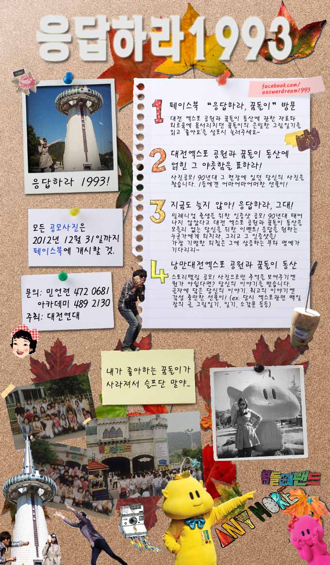 대전충남민언련과 대전시민아카데미에서는 대전 엑스포 공원과 꿈돌이 동산이 사라진다는 현실을 개탄스럽게 생각하며 꿈돌이 생각하기 놀이를 진행하려 합니다. 페이스북 "응답하라, 꿈돌이"( www.facebook.com/answerdream1993 )을 방문하셔서 꿈돌이와 연관된 자신만의 사진과 추억 조각을 올려주세요! 자세한 설명은 포스터 및 페이스북을 참고해주세요! 아참, 상품도 있어요. 문의: 민언련 042-472-0681, 아카데미 042-489-2130