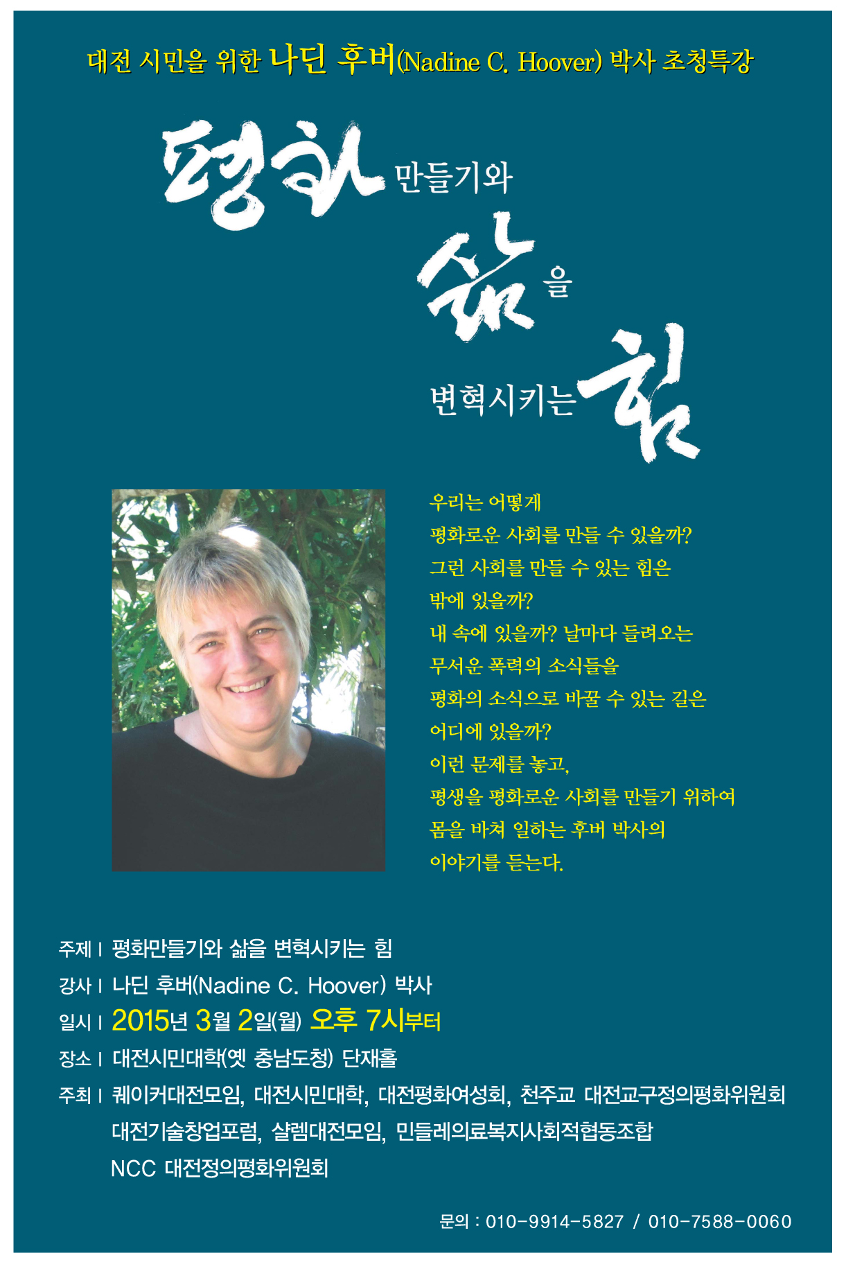 매일 살벌한 폭력의 소식이 끊이지 않을 뿐만 아니라, 그 잔인함을 더욱 더 해 가는 지금 어떻게 하면 우리 세계와 인류가 평화로운 기운으로 살 수 있는가를 고민할 때, 마침 그것에 오래도록 참여하고 관심을 가지신 좋은 선생님을 모시고 이야기를 듣는 시간을 마련하였습니다.