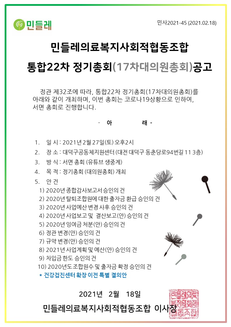 제목 [2021총회공지] 제22차 정기총회 (제17차 대의원총회)
