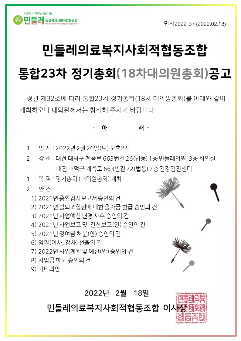 *대의원 총회는 위임이 되지 않습니다. 대의원님들은 꼭! 참석해 주세요 *총회에 참석하시는 대의원님들께 소정의 상품을 선물로 드립니다