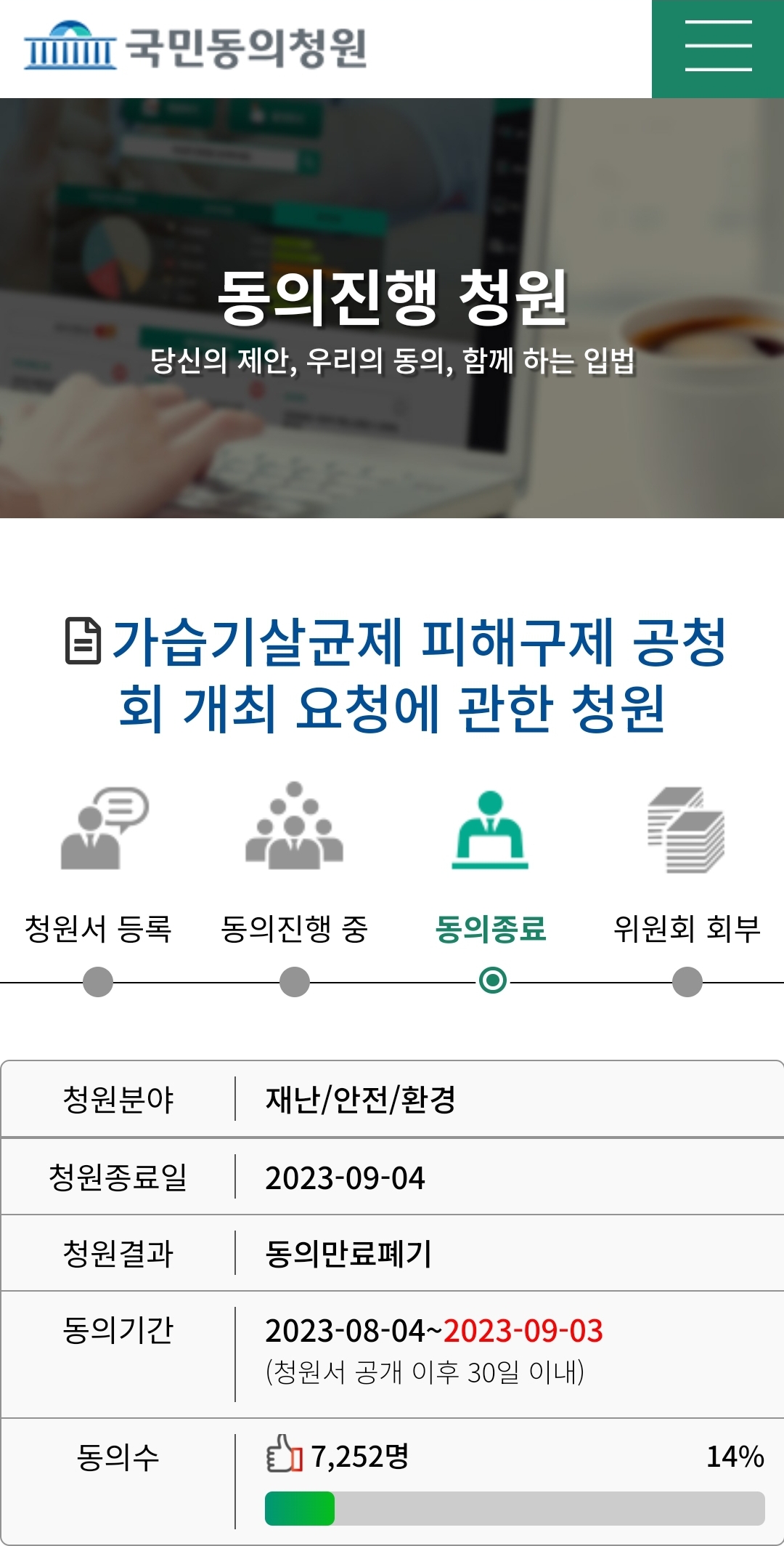 일전에 요청드렸던 «가습기살균제 피해구제 공청회 개최 요청에 관한 청원»이 지난 9월4일 종료되었습니다.