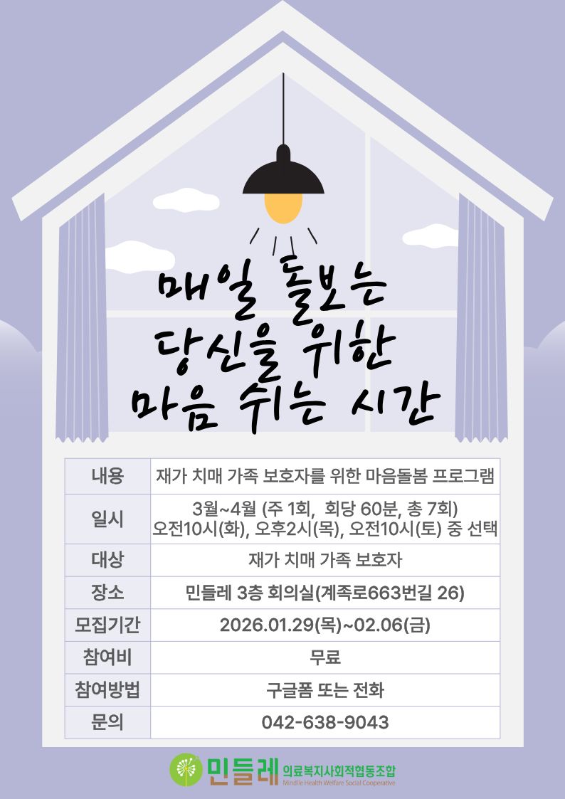 | 작성자 | 민들레의료복지사회적협동조합(mindlle) | 작성일 | 2026-01-29 | 조회수 | 1570 |