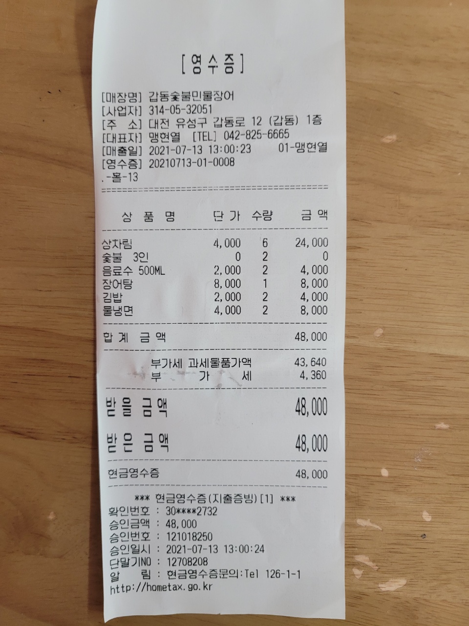 갑동숯불민물장어/2021.07.13/식비/48,000원 청정수산/2021.07.13/식비/30,000원 헤비츠/2021/.07.13/음료/12,000원