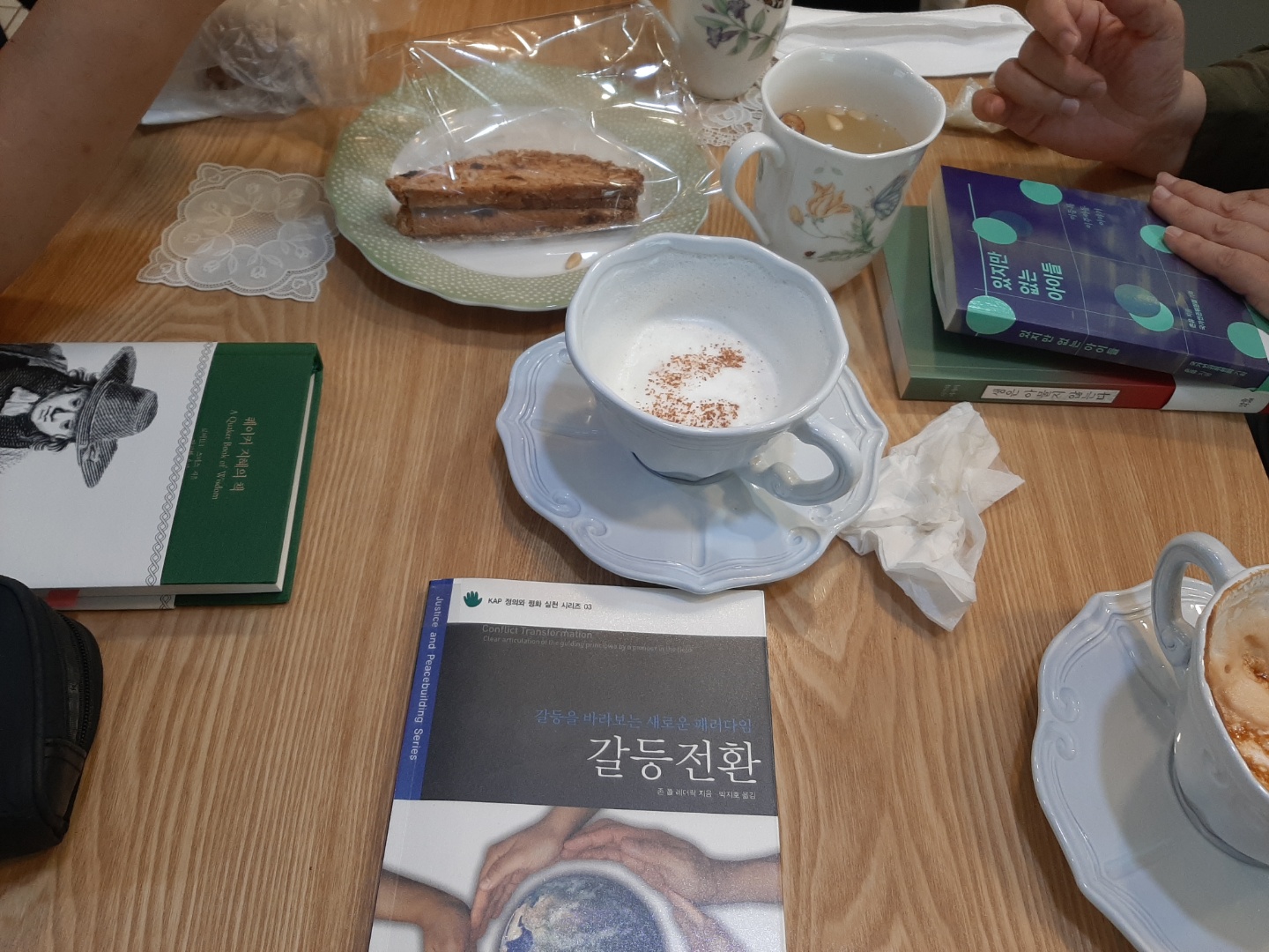 건강활동하는 날로 약속을 잡았는데 비가와서 독서 모임을 함. 각자 읽은 책을 가져와서 책 내용을 공유하며 성찰하면서 정신적 건강활동을 함.